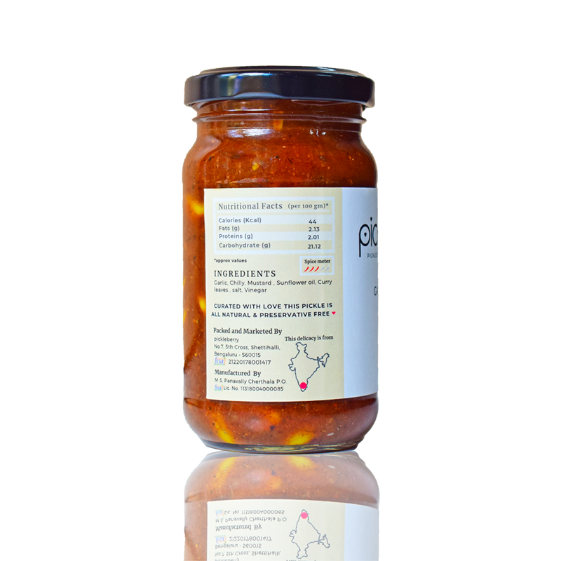 Garlic, Sunflower oil, Ginger, Salt, Chilly Powder, Mustard, Asafoetida, Turmeric powder, Curry leaves, Vinegar