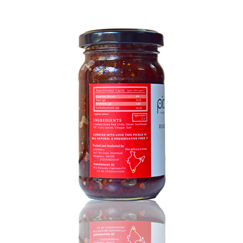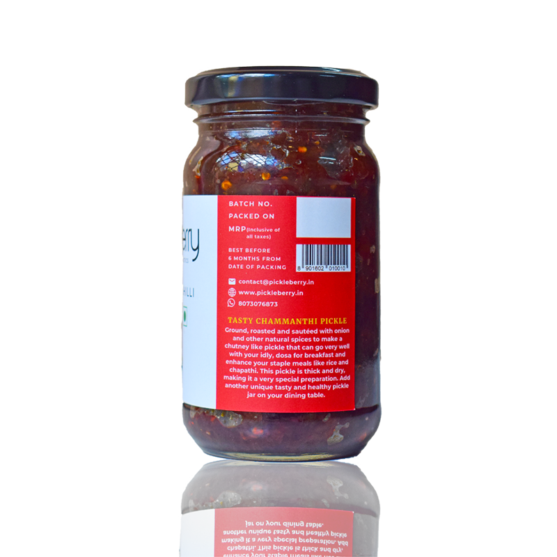 Roasted dry red chilli pickle is called chammanthi in Kerala where this recipe is celebrated. Ground and sautéed with onion and other natural spices to make a chutney like pickle that can go very well with your idly, dosa for breakfast and enhance your staple meals like rice and chapathi. This pickle is thick and on the dry side unlike generic pickles, which makes it a very special preparation to add another unique tasty and healthy pickle jar on your dining table.